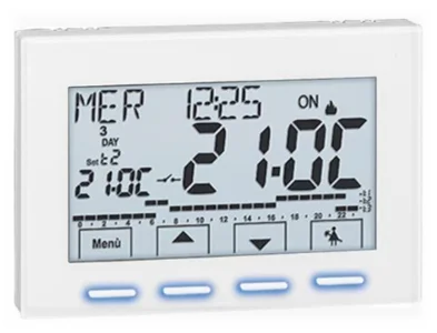 - ثرموستات قابل للبرمجة الأسبوعية، مناسب لكل أنظمة التدفئة والتبريد، مع شاشة إضاءة خلفية؛ للتحكم اللحظي في استخدام كل الوظائف.
